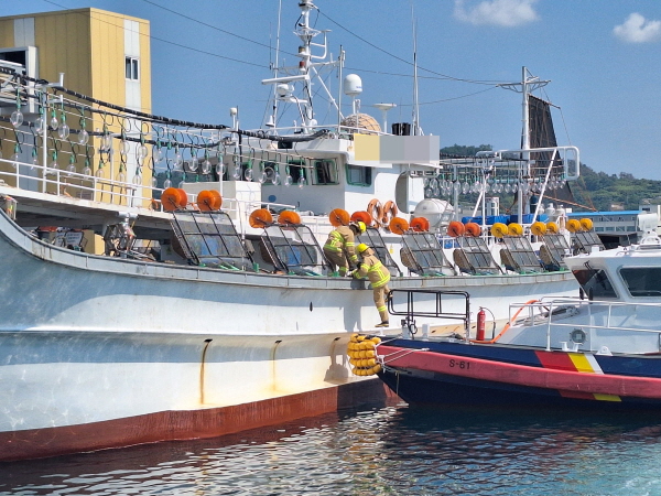훈련 주요 내용은 ▲주변 계류선박 분리 및 안전관리 ▲소화기와 방화복을 이용한 초기 진화 ▲등선팀을 통한 선내 고립자 구조 ▲응급처치 및 긴급 이송 ▲해경함정을 이용한 본격 진화 등으로 진행됐다.