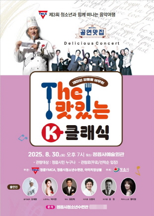 전북 정읍사예술회관에서 오는 30일 저녁 7시 열리는 정읍YMCA·정읍시청소년수련관·아미치앙상블 주관, 제3회 청소년과 함께 떠나는 음악여행 ‘The 맛있는 K-클래식’ 연주회에는 ‘아미치 앙상블’ 대표 바리톤 김재창 씨와 바리톤 오동국 교수, 바리톤 정 경 씨, 소프라노 박서연 씨, 테너 정찬혁 씨, 피아노 평미영 씨가 무대에 올라 멋진 K-클래식의 향연을 선사한다.