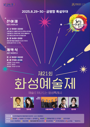 행사는 29일 전야제를 시작으로 30일 개막식에서는 MC 주병선, 정하영과 함께 초대가수 사랑과평화, 이진관, 김시아가 무대를 빛낼 예정이며 이외에도 화성예총 산하 지부별 대표 행사와 프로그램이 준비돼 있다.
