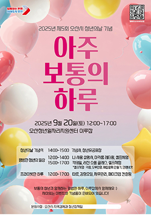 (경기=NSP통신) 조현철 기자 = 경기 오산시(시장 이권재)가 법정기념일인 청년의 날을 맞아 9월 20일 2025년 제5회 오산시 청년의 날 기념행사 ‘아주 보통의 하루’를 개최한다.
