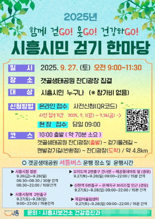 (경기=NSP통신) 서국현 기자 = 경기 시흥시(시장 임병택)는 시민의 건강한 생활 습관 확산과 활기찬 지역 공동체 조성을 위해 오는 27일 오전 9시 갯골생태공원 잔디광장에서 ‘2025년 제3회 시흥시민 걷기 한마당’을 개최한다.