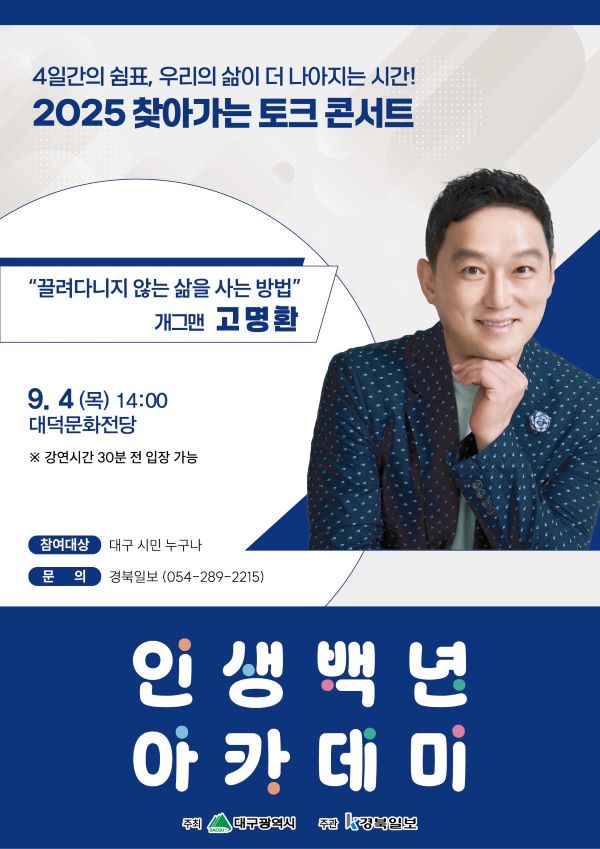 특히 고명환은 ‘2025 대구 올해의 책’에 선정된 저서 ‘고전이 답했다 마땅히 살아야 할 삶에 대하여’의 저자로 고전 속 지혜와 본인의 경험을 바탕으로 시민들에게 깊이 있는 인생의 통찰을 전할 예정이다.