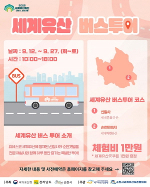 (전남=NSP통신) 남정민 기자 = 전남 순천시(시장 노관규)와 순천시 세계유산보존협의회(위원장 김준선)는 오는 12일부터 27일까지 세계유산을 하루에 둘러볼 수 있는 ‘2025 세계유산축전 선암사·순천갯벌 버스투어’를 운영한다.