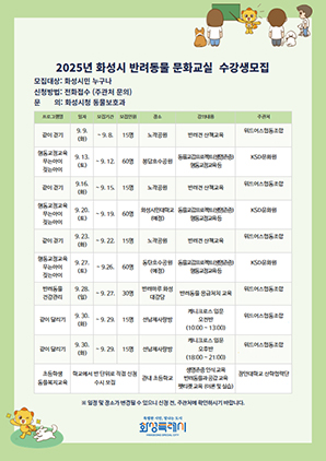 (경기=NSP통신) 조현철 기자 = 경기 화성시(시장 정명근)가 건강하고 성숙한 반려 문화를 정착하기 위한 ‘2025년 반려동물 문화교실’ 수강생을 모집한다.