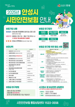 (경기=NSP통신) 김병관 기자 = 경기 안성시(시장 김보라)는 예기치 못한 사고로 피해를 입은 시민들의 생활안정과 복지 향상에 기여하기 위해 ‘2025년 안성시 시민안전보험’을 지속적으로 운영하고 있다.