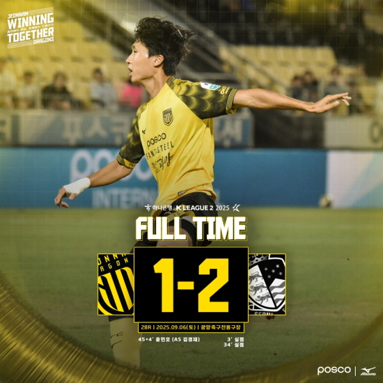 (전남=NSP통신) 김성철 기자 = 전남드래곤즈(이하 전남)가 지난 6일 토요일 저녁 7시 광양축구전용구장에서 열린 하나은행 K리그2 2025 28라운드 서울 이랜드 FC(이하 서울E)와의 홈경기에서 1-2로 아쉽게 패배하며 4위에 머물렀다.