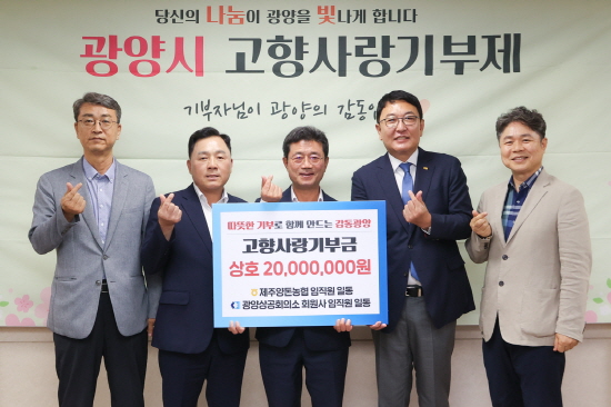 (전남=NSP통신) 김성철 기자 = 광양상공회의소(회장 우광일)는 지난 9일 제주양돈농협 고권진 조합장이 광양시청을 방문해 고향사랑기부제 교차기부금 2000만원을 전달했다고 밝혔다.