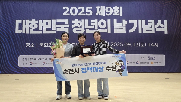 (전남=NSP통신) 남정민 기자 = 전남 순천시(시장 노관규)가 청년이 체감할 수 있는 정책 추진 성과를 인정받아 ‘2025년 청년친화헌정대상’에서 정책대상을 수상했다고 15일 밝혔다. 시상식은 지난 13일 국회의원회관 대회의실에서 열린 ‘제9회 대한민국 청년의 날’ 기념식과 함께 진행됐다.