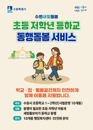 (경기=NSP통신) 조현철 기자 = 경기 수원시(시장 이재준)가 초등학교 저학년의 안전한 등하교를 지원하는 ‘수원새빛돌봄 초등 저학년 등하교 동행돌봄 서비스’ 시범사업을 12월 31일까지 10개 동에서 운영한다.