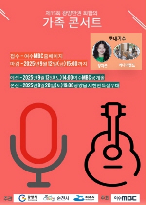 (전남=NSP통신) 김성철 기자 = 광양시는 오는 9월 20일 오후 7시 광양읍 서천변 특설무대에서 ‘제15회 광양만권 화합의 가족콘서트’가 열린다고 밝혔다.
