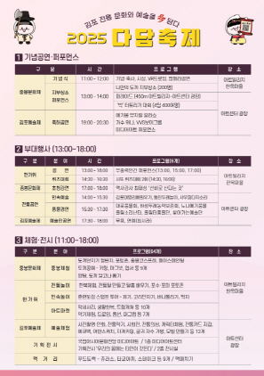 오전 11시부터 저녁까지 즐길 수 있는 이번 다담축제는 70여 개의 다양한 체험과 부대행사가 준비돼 있다. 도끼 던지기 챌린지와 도끼 공예, 페이스페인팅을 즐길 수 있고 양탕 시식과 도끼 달고나 뽑기도 참여할 수 있다. 제기와 고리던지기, 버나돌리기, 딱지 등 훈련도감 스탬프 투어와 무중력인간 퍼포먼스 공연, 사또 퀴즈대회도 진행된다.