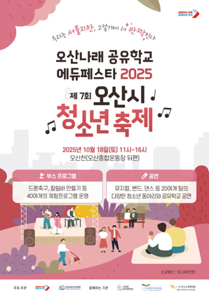 (경기=NSP통신) 조현철 기자 = 경기 오산시(시장 이권재)가 다음달 18일 오전 11시부터 오후 4시까지 오산종합운동장 뒤편 오산천 잔디밭에서 화성오산교육지원청과 공동으로 ‘오산나래공유학교 에듀페스타 2025 & 제7회 오산시 청소년 축제’를 개최한다.