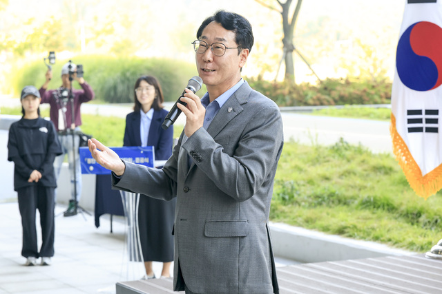 1일 정명근 화성시장이 동탄호수공원 주차타워 준공식에서 인사말을 하고 있다. (사진 = 화성시)