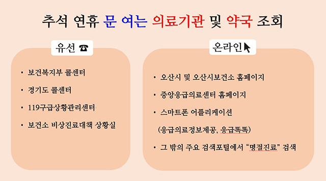 추석 연휴 기간 이용 가능한 의료기관과 약국 정보는 ▲오산시 및 보건소 홈페이지 ▲중앙응급의료센터 홈페이지▲스마트폰 앱(응급의료정보제공, 응급똑똑) ▲보건복지부 콜센터(129) ▲경기도 콜센터(120) ▲119구급상황관리센터 등을 통해 쉽고 편리하게 확인할 수 있다.