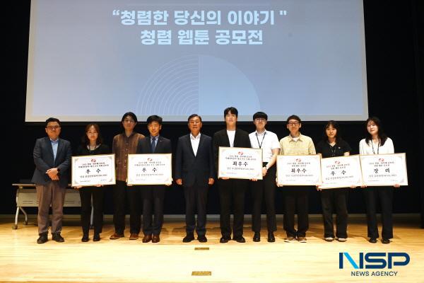 이번 공모전은 임직원을 대상으로 한 ▲청렴한 부패취약분야 개선 우수사례 ▲청렴한 당신의 이야기를 그리는 청렴 웹툰 부문과 김천시 소재 초등학생이 참여하는 ▲우리지역 청렴 히어로! 그림 부문으로 나누어 진행됐다.