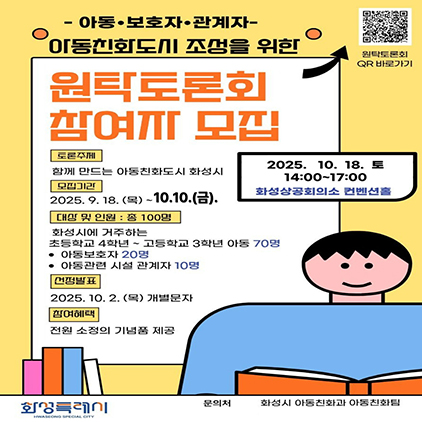 (경기=NSP통신) 조현철 기자 = 경기 화성시(시장 정명근)가 오는 18일 오후 2시 화성상공회의소 컨벤션홀에서 개최되는 ‘아동친화도시 조성을 위한 원탁토론회’ 참가자를 모집한다.