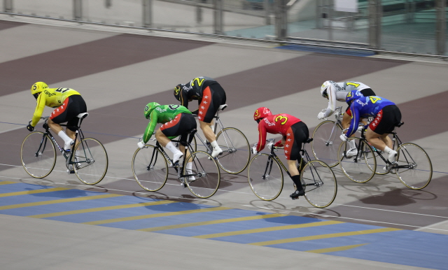 NSP통신-광명스피돔에서 열린 경륜 경주에 출전한 선수들이 결승선을 향해 힘차게 페달을 밟고 있다. (사진 = 국민체육진흥공단)