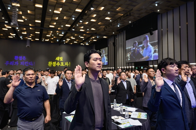 7월 수원컨벤션센터에서 새빛 환경수호자 발대식이 열린 가운데 999명의 환경수호자들이 실천 다짐 퍼포먼스를 하고 있다. (사진 = 수원시)
