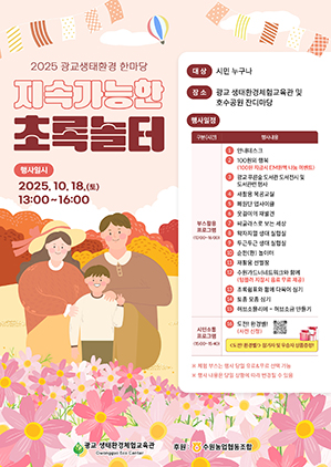 (경기=NSP통신) 조현철 기자 = 경기 수원시(시장 이재준)가 18일 오후 1시부터 4시까지 광교호수공원 광교생태환경체험교육관 앞 잔디마당에서 ‘2025 광교생태환경한마당-지속가능한 초록놀터’를 연다.