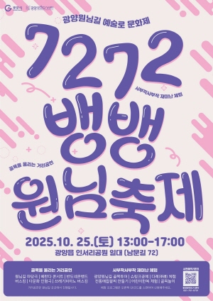 (전남=NSP통신) 김성철 기자 = 광양문화도시센터(센터장 박시훈, 이하 ‘센터’)는 오는 10월 25일 오후 광양읍 인서리공원 일대에서 광양원님길 브랜드 축제 ‘7272뱅뱅원님축제’를 개최한다고 밝혔다.