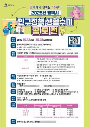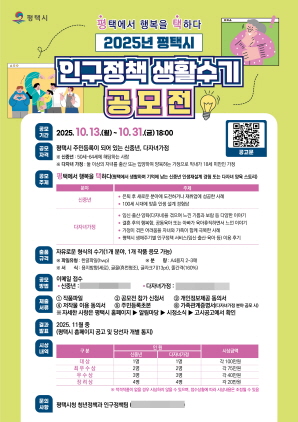 (경기=NSP통신) 김병관 기자 = 경기 평택시(시장 정장선)는 2025년 평택시 인구정책 생활수기 공모전 ‘평택에서 행복을 택하다’를 오는 31일까지 개최한다.