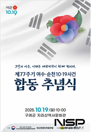 (전남=NSP통신) 김성철 기자 = 구례군은 여순사건의 역사적 의미를 되새기고 희생자와 유족들을 위로하기 위한‘여순사건 제77주기 정부주최 합동추념식’이 오는 19일 구례군 지리산역사문화관에서 개최된다고 밝혔다.