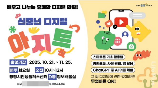 디지털 기기 활용에 어려움을 느끼는 시민은 별도 신청이나 비용 없이 광명시인생플러스센터 정보배움실을 방문해 스마트폰 기초 사용법과 생성형 인공지능(AI) 앱 활용 등 궁금한 내용을 1:1로 코칭받을 수 있다.