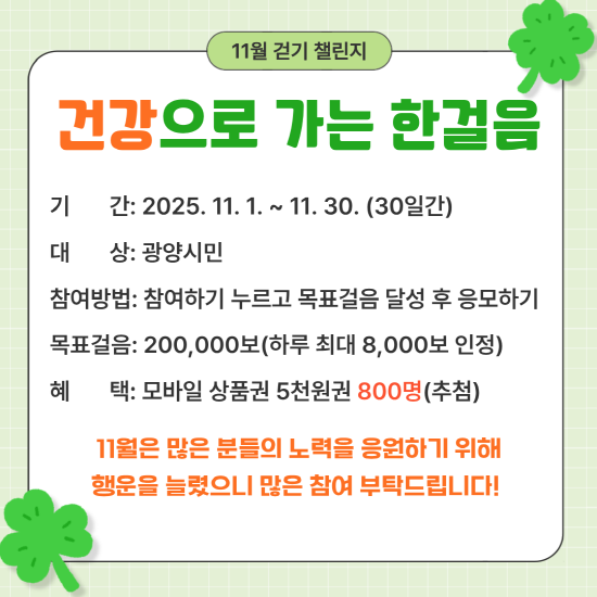 광양시, 워크온 ‘건강으로 가는 한걸음 11월 걷기 챌린지’ 운영
