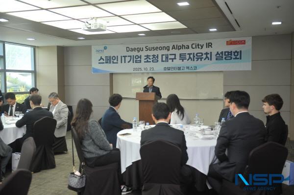 (경북=NSP통신) 김대원 기자 = 대구경북경제자유구역청(청장 김병삼, 이하 DGFEZ)은 23일 호텔인터불고 EXCO에서 주한스페인상공회의소(회장 Roger Royo, 이하 ESCCK)와 공동으로 스페인 IT기업을 초청한 대구 투자유치 설명회를 개최했다.