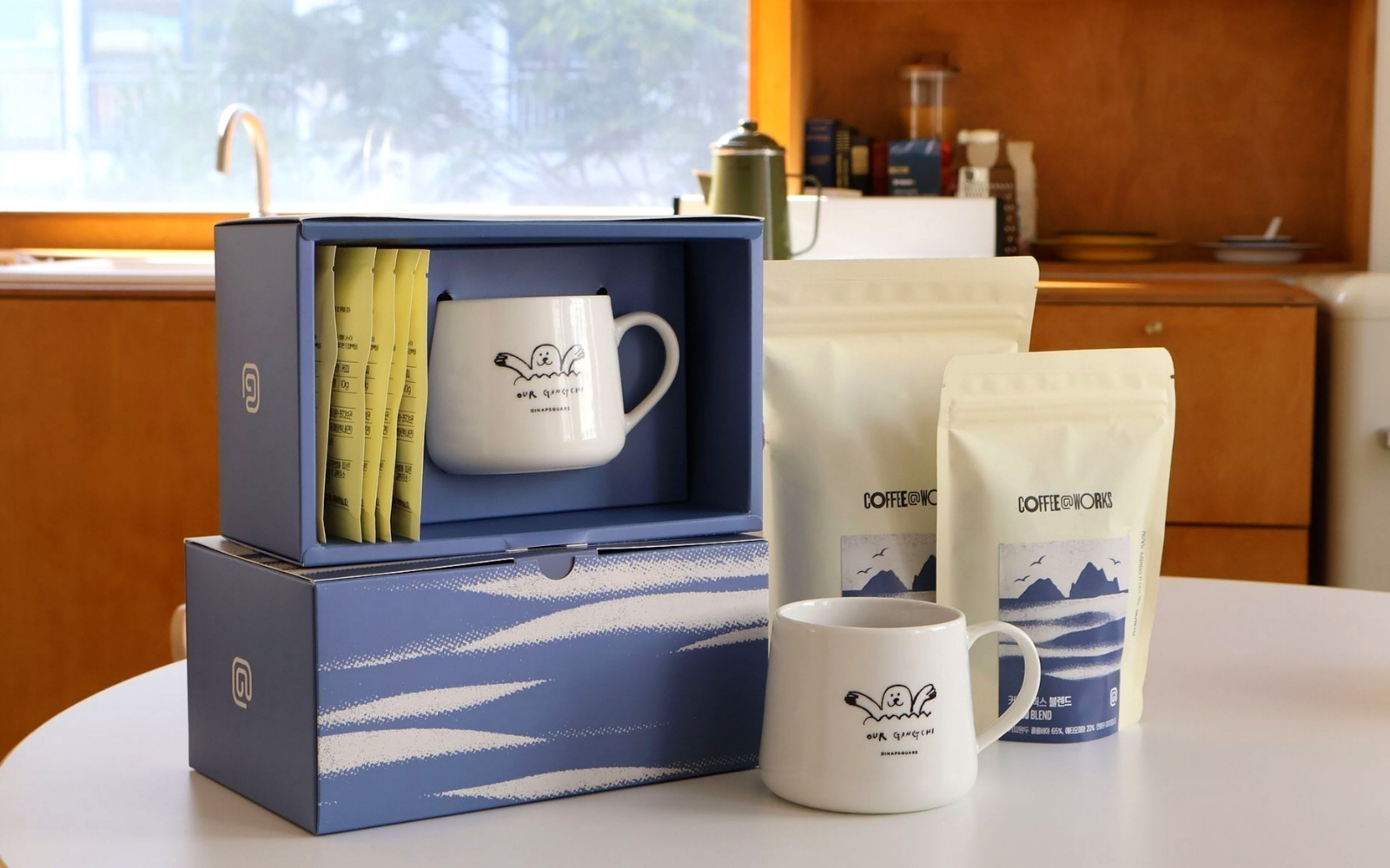 또 커피앳웍스는 독도문방구와의 협약을 통해 독도문방구 디자인을 활용한 기념굿즈도 선보인다. 멸종된 독도 바다사자 ‘강치’일러스트가 담긴 머그컵을 드립백과 함께 구성한 세트도 판매된다.