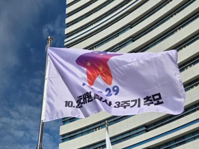 (경기=NSP통신) 김병관 기자 = 10.29 이태원 참사 3주기를 맞아 경기도가 25일부터 경기도 청사에 참사 추모기를 게양하고 ‘10.29 이태원 참사 기억하고 함께 하겠습니다’라는 문구의 플래카드를 게시했다.