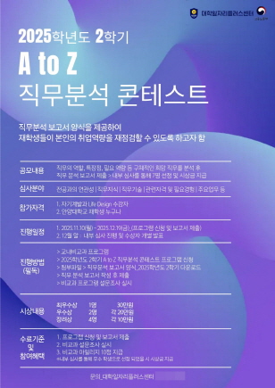 대학일자리플러스센터가 오는 10일부터 12월 19일까지 운영하는 ‘A to Z 직무 분석콘테스트 프로그램’은 재학생들이 본인이 희망하는 직무를 탐색 후 직무보고서를 직접 작성해 봄으로써 본인의 희망 직무를 위해 필요한 역량을 재점검할 수 있도록 하는 것을 목표로 하고 있다.
