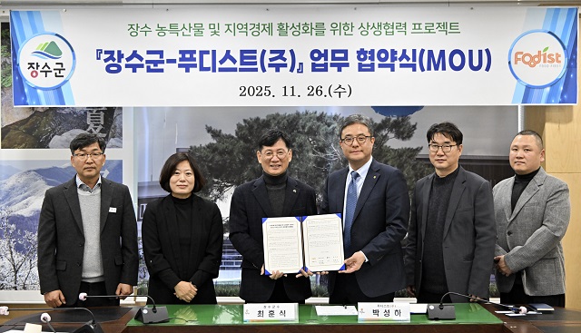 이날 협약식에는 최훈식 장수군수를 비롯해 푸디스트 주요 실무·책임자가 참석해 군 농특산물·레드푸드 판로 확대와 지역 일자리, 축제 홍보, 사회공헌으로 이어지는 다양한 협력 의지를 공유했다.