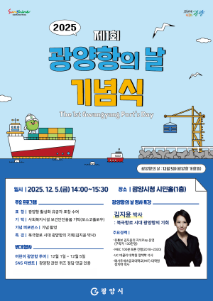 (전남=NSP통신) 김성철 기자 = 광양시는 오는 12월 5일 오후 2시 시청 시민홀에서 ‘제1회 광양항의 날’ 기념식을 열고 명사 특강을 진행한다고 밝혔다.