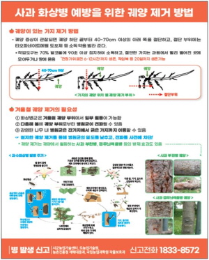 특히 동계 정지·전정 시 사용하는 가위·톱 등 작업도구와 장갑을 통한 전염 가능성이 큰 만큼 작업 전·후 소독을 반드시 실시하고 절단면에는 방제약제를 도포해 추가 감염을 예방해야 한다.