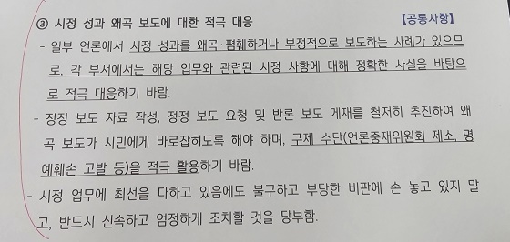 본지가 입수한 시정 성과 왜곡 보도에 대한 ‘적극 대응’ 지침 문건에 따르면 정 시장은 최근 일부 언론의 보도 사례를 언급하며 “시정 성과를 왜곡·폄훼하거나 부정적으로 보도하고 있다”고 유감을 표했다.