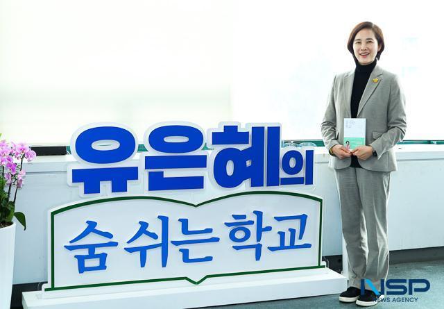 NSP통신-유은혜 경기도교육감 예비후보가 숨 쉬는 학교 문구가 적힌 슬로건 조형물 앞에서 포즈를 취하며 사진촬영을 하고 있다. (사진 = 조현철 기자)