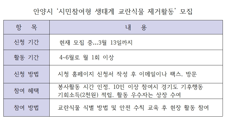 (경기=NSP통신) 김여울 기자 = 경기 안양시(시장 최대호)가 ‘시민참여형 생태계 교란식물 제거활동’ 참가자를 선발한다. 건강한 하천 생태계 조성과 생물다양성 보전을 위해 추진되면서 하천 생태계 건강성 회복 변화가 예상된다.