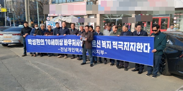 광양시 개인택시 광양시지부 소속 조합원 20여 명은 12일 광양읍 개인택시 조합 사무실 앞과 인동 로터리 일대에서 입장문을 발표했다. 이들은 조합원 123명 중 64명이 서명에 참여했다고 밝혔다.