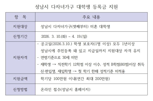 지원 대상은 올해 1월 1일 기준 30세 미만의 셋째 이상 미혼 대학생이다. 공고일인 3월 10일 기준 학생과 보호자(1명 이상) 모두 1년 이상 성남에 주민등록이 돼 있고 지급일까지 자격을 유지해야 한다.