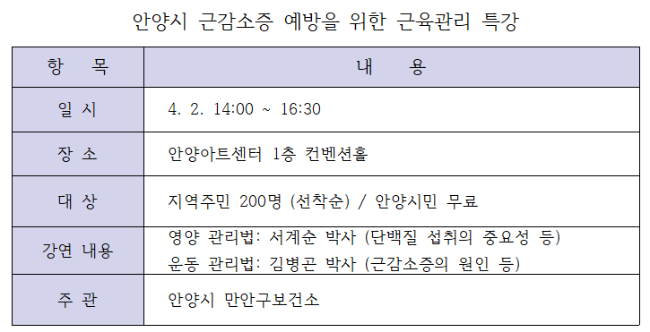 (경기=NSP통신) 서국현 기자 = 경기 안양시 만안구보건소(소장 한영자)는 4월 2일 안양아트센터에서 ‘지역주민 근감소증 예방을 위한 영양·운동관리 건강강좌’를 개최한다.