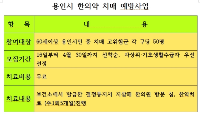 (경기=NSP통신) 김병관 기자 = 경기 용인시가 고령화 시대에 발맞춰 ‘2026년 한의약 치매예방 프로그램’ 참여자 50명을 다음 달 30일까지 받는다.