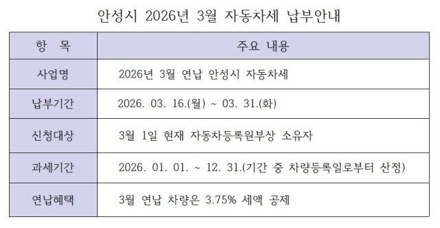 (경기=NSP통신) 김병관 기자 = 안성시가 세액 공제를 통해 가계 부담을 줄일 수 있는 자동차세 연납 신청을 3월에도 이어간다.