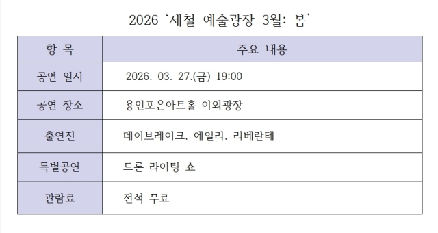 경기 용인문화재단은 오는 27일 특별한 봄맞이 축제인 ‘제철 예술광장 3월 : 봄’ 콘서트를 공연형 문화행사로 연다.