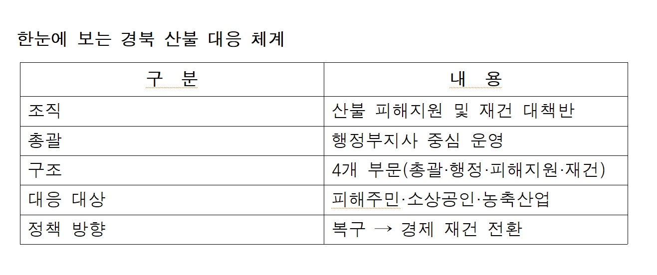 (경북=NSP통신) 조인호 기자 = 경상북도가 산불 피해 대응 조직을 확대 개편하며 복구를 넘어 지역경제 회복까지 포함한 통합 대응 체계를 가동한다. 단순 재난 복구가 아닌 소득 기반 재건과 산업 회복까지 연계하는 구조로 정책 범위를 확장한 것이 특징이다.