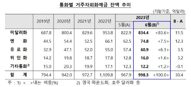 24日、韓国銀行が発表した「2023年6月中の居住者外貨預金動向」によると、6月末の外国為替銀行の居住者外貨預金は998億3000万ドルで前月末対比30億4000万ドル増加した。