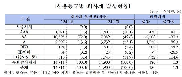8日、金融投資協会がまとめた「2024年2月場外債券市場動向」によると、先月の債券発行数は国債、特殊債、金融債、ABSが増加し、前月比7兆9000億ウォン増えた71兆8000億ウォンを記録した。そのうち社債は14兆9000億ウォンで、前月比1860億ウォン増加した。社債の純発行額は5兆3660億ウォンと集計された。