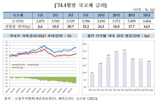 金投協は「韓国債券金利は、韓国銀行金融通貨委員会の金利凍結決定(現3.50%)が予想に沿った中、予想を上回った米国の雇用・物価指標と韓国の第1四半期GDP成長率が弱気となる材料として作用して上昇した」と明らかにした。