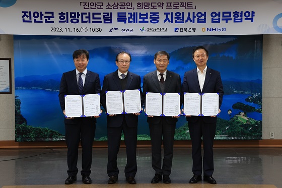 이번 협약식을 통해 진안군은 6억원의 출연금과 최대 5년간 대출이자의 3%를 이차보전으로 지원하고, 전북은행과 NH농협은행은 각각 2억 5000만원을 출연해 진안군과 함께 총 11억원을 출연할 예정이다.