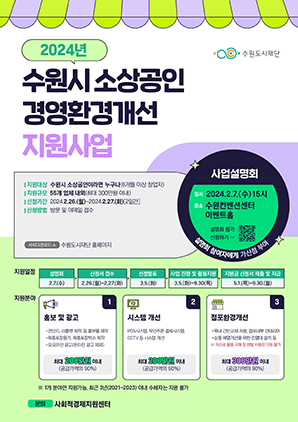 특히 이번 지원 사업을 위해 수원시와 도시재단은 오는 2월 7일 수원컨벤션센터 이벤트홀에서 사업 설명회를 연다. 소상공인 경영환경개선 지원사업과 함께 수원시의 소상공인 지원사업을 안내할 계획이다. 설명회 참여자에게는 사업 신청 시 가산점이 부여된다.